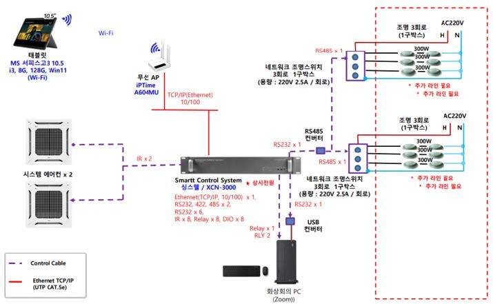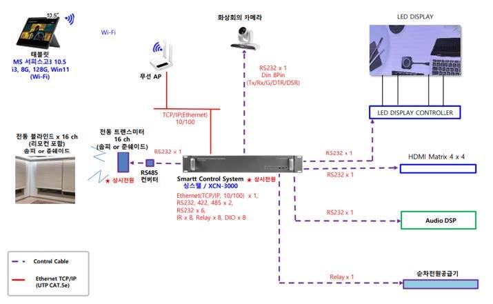 이 시스템은 사용자 친화적인 인터페이스를 통해 모든 영상과 음향 장치를 제어합니다. 또한, 조명, 블라인드, 카메라, 화상회의 PC, 영상 매트릭스, LED 디스플레이 컨트롤러, 그리고 시스템 냉난방기까지 포괄적으로 관리합니다. 사용자 맞춤형 UX/UI 디자인 기반의 통합운영 프로그램은 사용자에게 직관적이고 편리한 조작 경험을 제공합니다.