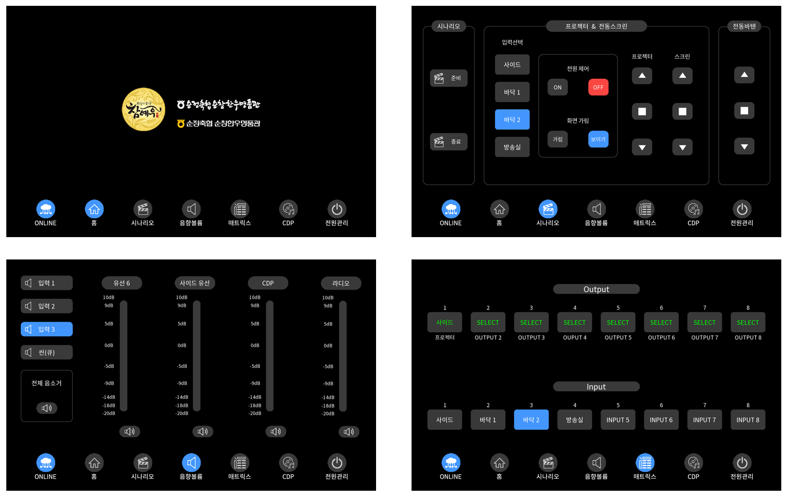 디지털 오디오 믹서를 TCP/IP 제어, 전동스크린 및 순차전원기, 리프트등을 통합제어 하였다.