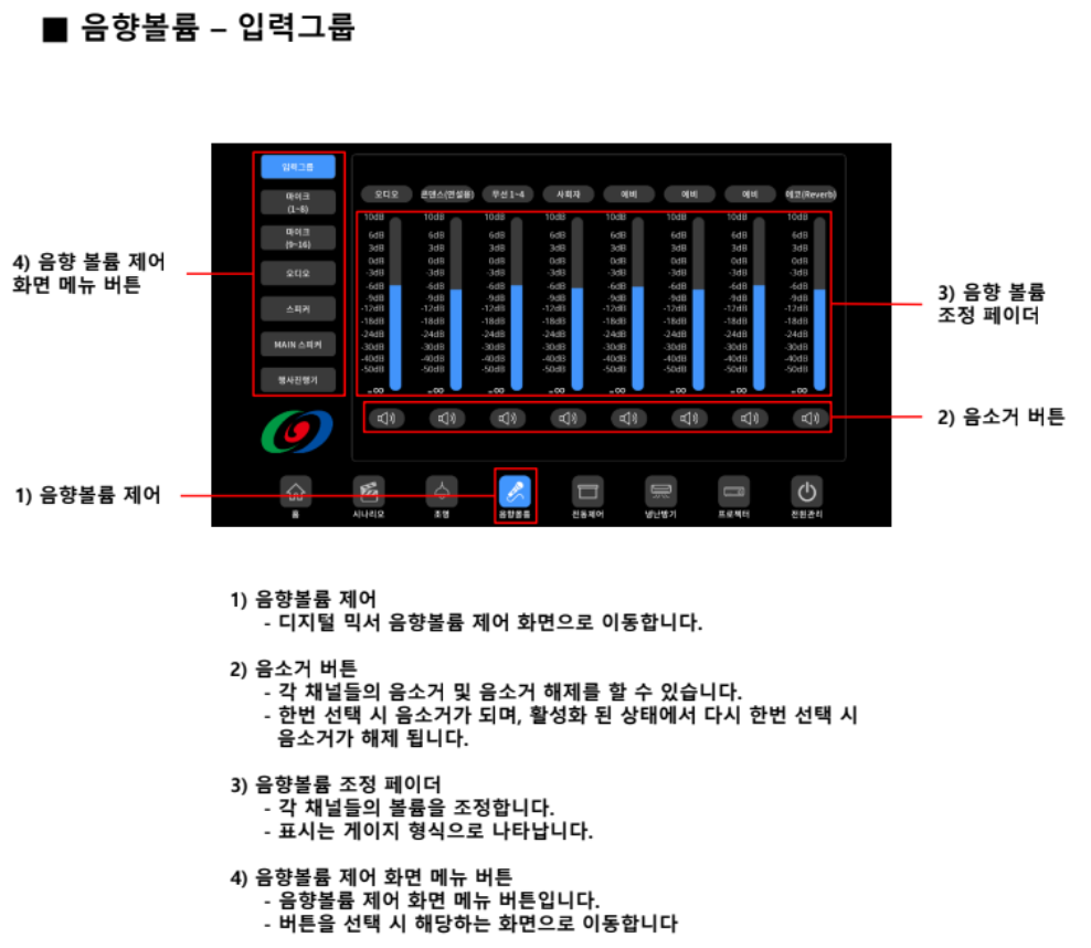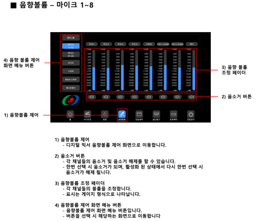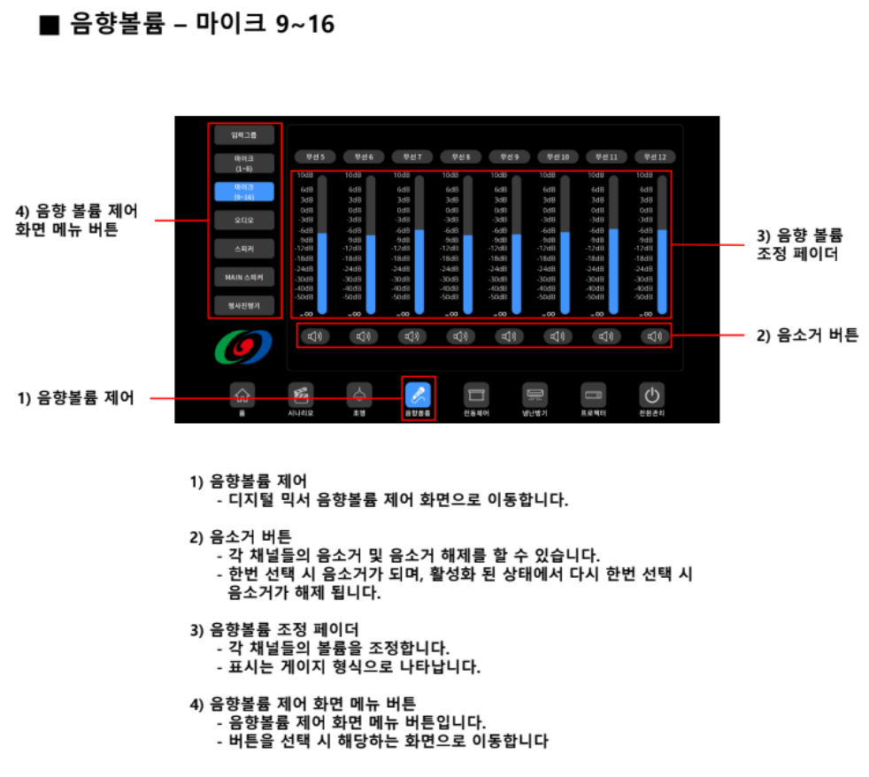사운드 제어: 디지털 믹서 인터페이스를 사용하여 다양한 구역에 대한 음소거 및 볼륨 제어를 포함하여 오디오 레벨을 조정하는 단계를 자세히 설명합니다.