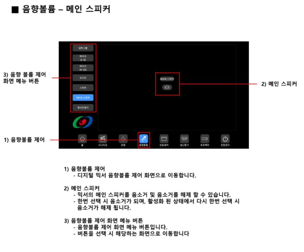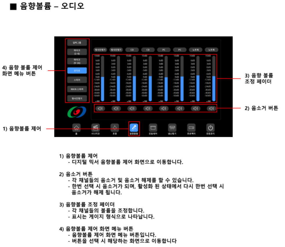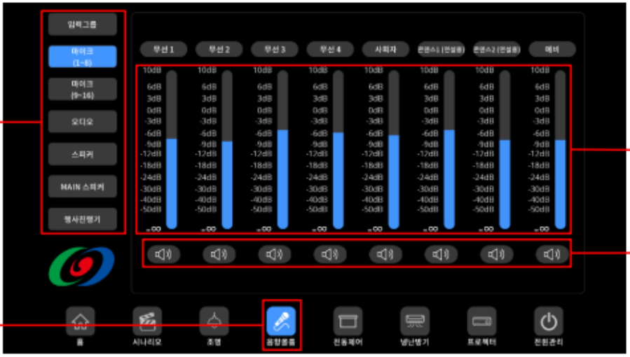 사운드 제어: 디지털 믹서 인터페이스를 사용하여 다양한 구역에 대한 음소거 및 볼륨 제어를 포함하여 오디오 레벨을 조정하는 단계를 자세히 설명합니다.