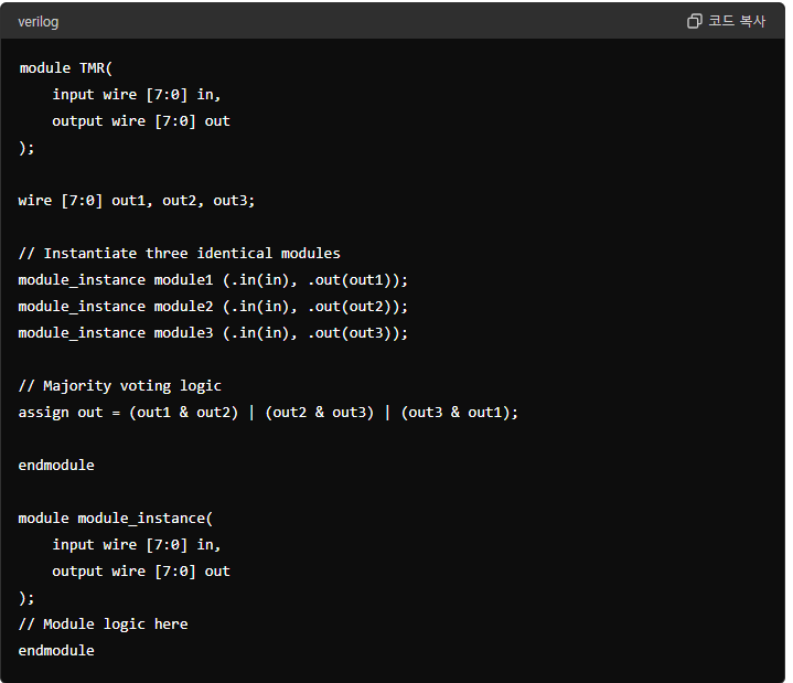 다수 투표 메커니즘: 세 개의 하드웨어 인스턴스에서 출력을 가져와 다수 투표에 따라 올바른 출력을 결정하는 투표 로직을 구현합니다. 이는 SEU의 영향을 받는 단일 인스턴스의 오류를 마스킹하는 데 도움이 됩니다.