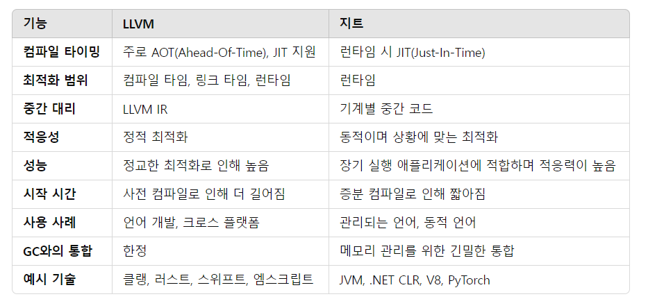LLVM은 컴파일 시간 동안 최적화가 적용되는 정적(Ahead-Of-Time) 컴파일에 사용될 수 있습니다.