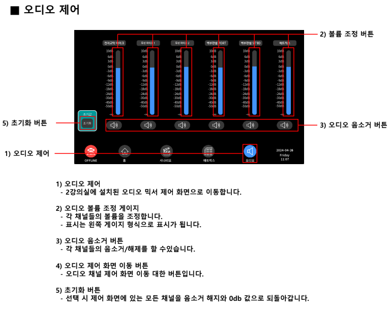 오디오 제어: 최적의 사운드 분배를 위해 오디오 레벨과 구성을 조정합니다.