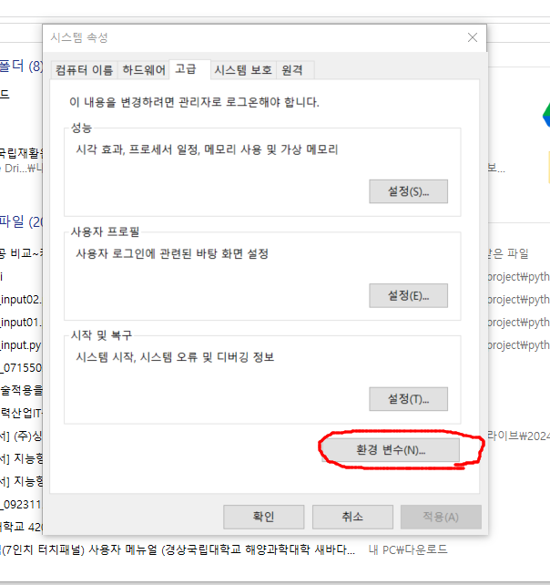 - '시스템 속성' 창의 '고급(Advanced)' 탭에서 '환경 변수(Environment Variables)...' 버튼을 클릭합니다.