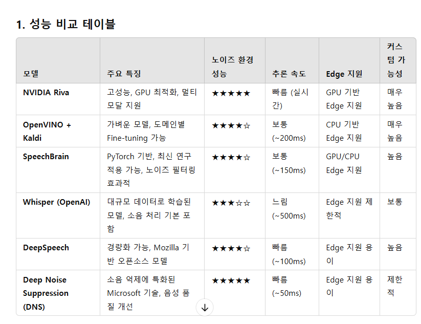 - 공장 환경에서 소음 처리에 특화된 모델로는 NVIDIA Riva, DeepSpeech, DNS와 같은 솔루션이 우수한 성능을 보입니다.