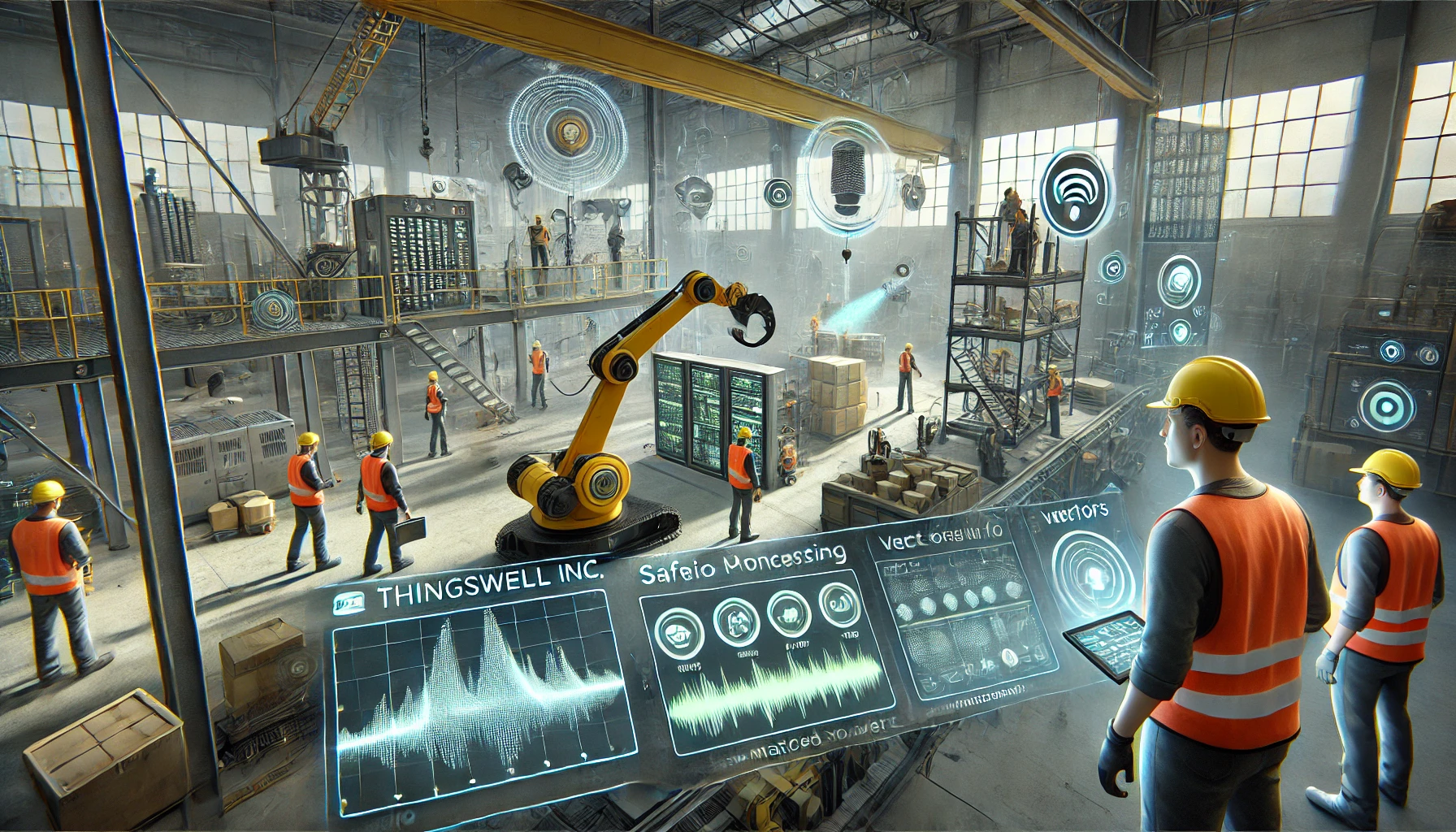 다음은 시끄럽고 역동적인 작업 환경에서 실시간 위험 감지 및 대응 기능을 보여주는 Thingswell Inc에서 개발한 산업 안전 모니터링 시스템의 그림입니다. 이미지는 산업 환경에 통합된 데이터 처리 흐름과 안전 기능을 강조합니다.