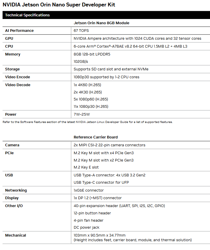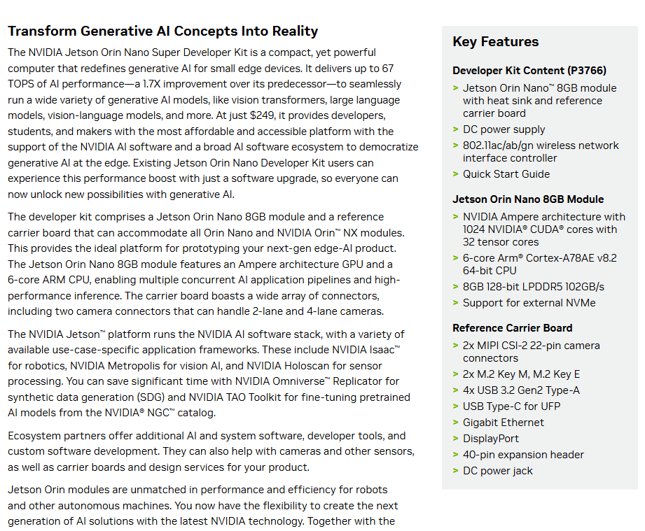 NVIDIA Jetson Orin Nano™ Super Developer Kit은 소형 엣지 디바이스를 위한 생성 AI를 새롭게 정의하는 작지만 강력한 컴퓨터입니다. 이전 모델보다 1.7배 향상된 최대 67 TOPS의 AI 성능을 제공하여 비전 트랜스포머, 대규모 언어 모델, 비전 언어 모델 등과 같은 가장 인기 있는 생성 AI 모델을 원활하게 실행합니다. 단 249달러에 개발자, 학생 및 제작자에게 NVIDIA AI 소프트웨어 와 광범위한 AI 소프트웨어 생태계를 지원하는 가장 저렴하고 접근하기 쉬운 플랫폼을 제공합니다. 기존 Jetson Orin Nano Developer Kit 사용자는 소프트웨어 업그레이드만으로 이러한 성능 향상을 경험할 수 있으므로 이제 모든 사람이 생성 AI로 새로운 가능성을 열 수 있습니다.