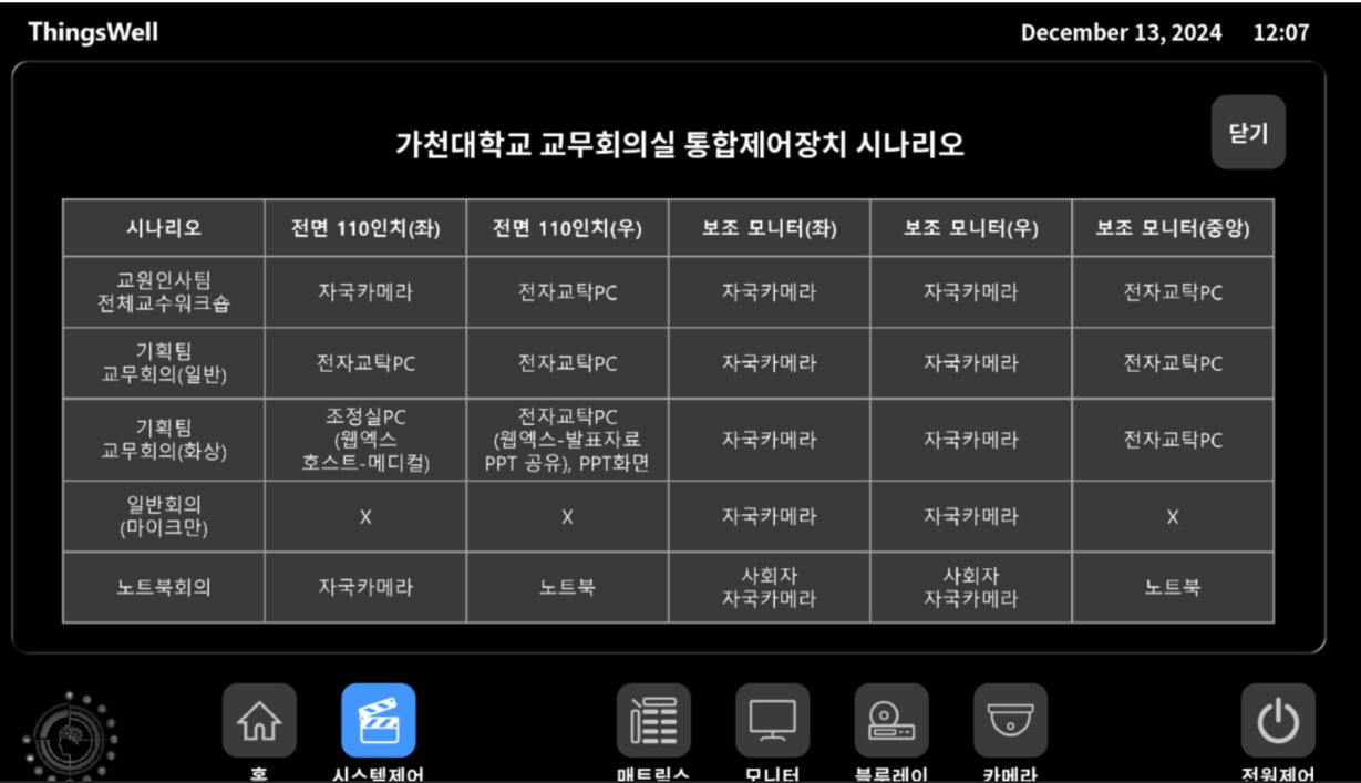 oo 대학교 교무회의실 통합제어시스템은 음향, 영상, 환경 제어를 중앙에서 관리할 수 있도록 설계된 최첨단 시스템입니다. 본 시스템은 회의 및 주요 행사 운영의 효율성을 극대화하며, 모든 연결 장치를 통합적으로 제어할 수 있는 편리성을 제공합니다.